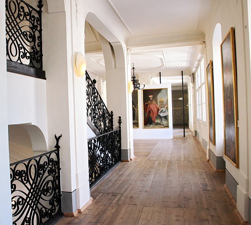man in das zweite Stockwerk. Im Gang hängen Bilder Tiroler Landesfürsten. Vor dem