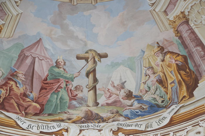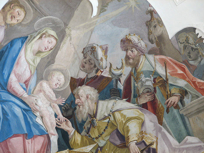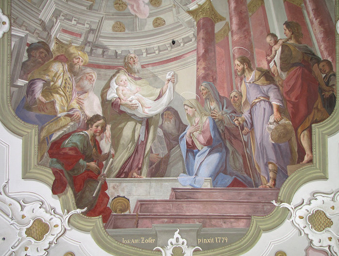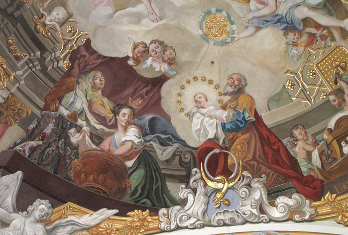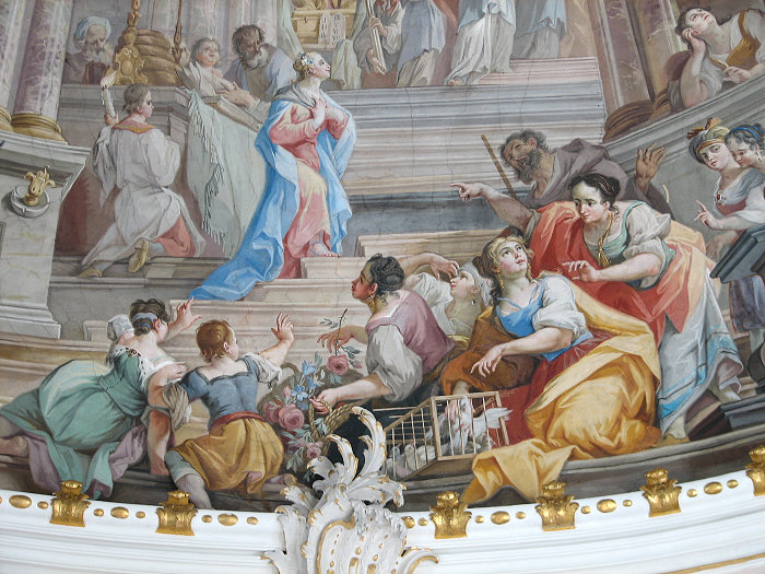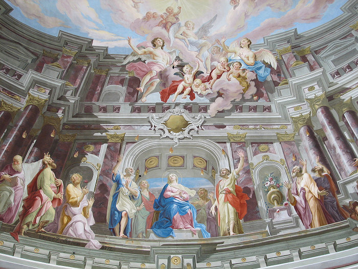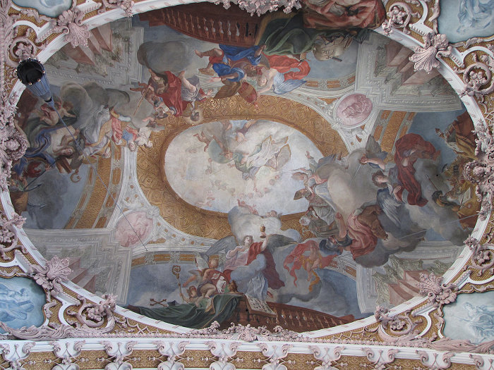 Bei Kaspar Waldmann (1657-1720) sind die Fresken noch von Stuckdekor umgeben, zu