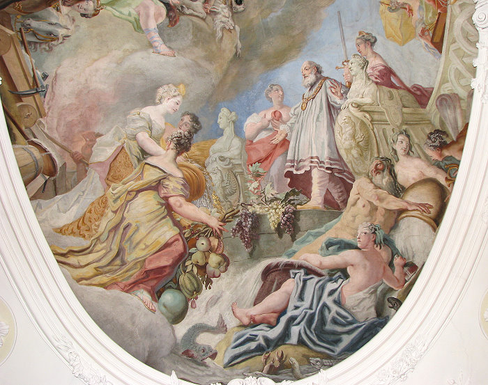 fortgesetzt und tragen ein Gewölbe. Von Asam stammt auch das Fresko im Sitzungssaal